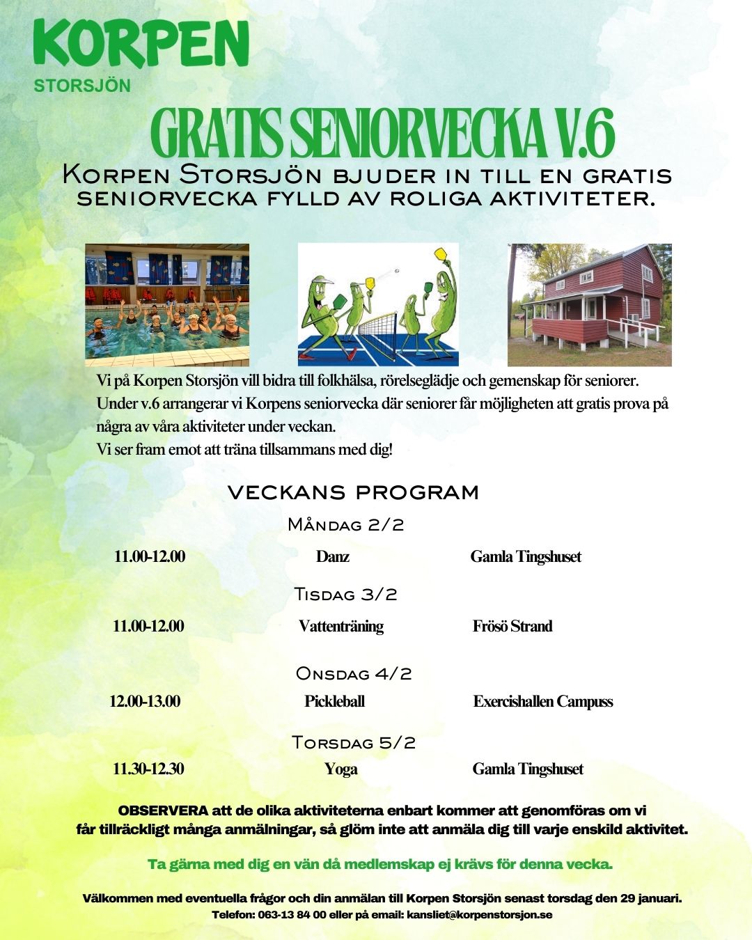 Under v.6 arrangerar vi Korpens seniorvecka där seniorer får möjligheten att gratis prova på några av våra aktiviteter under veckan.