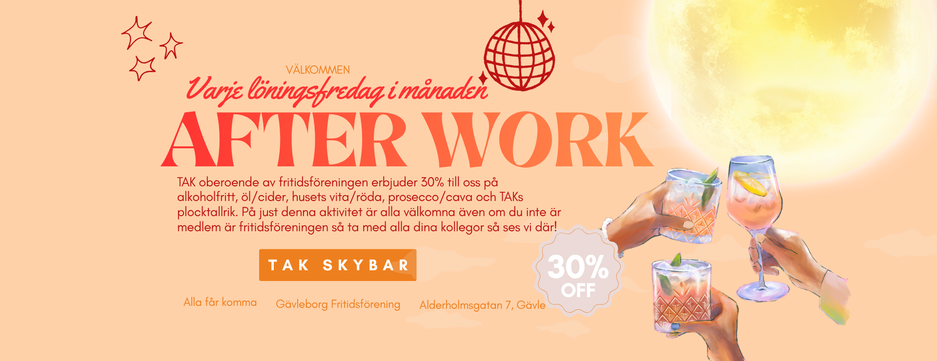 TAK oberoende av fritidsföreningen erbjuder 30% till oss på alkoholfritt, öl/cider, husets vita/röda, prosecco/cava och TAKs plocktallrik. På just denna aktivitet är alla välkomna även om du inte är medlem är fritidsföreningen så ta med alla dina kollegor så ses vi där!