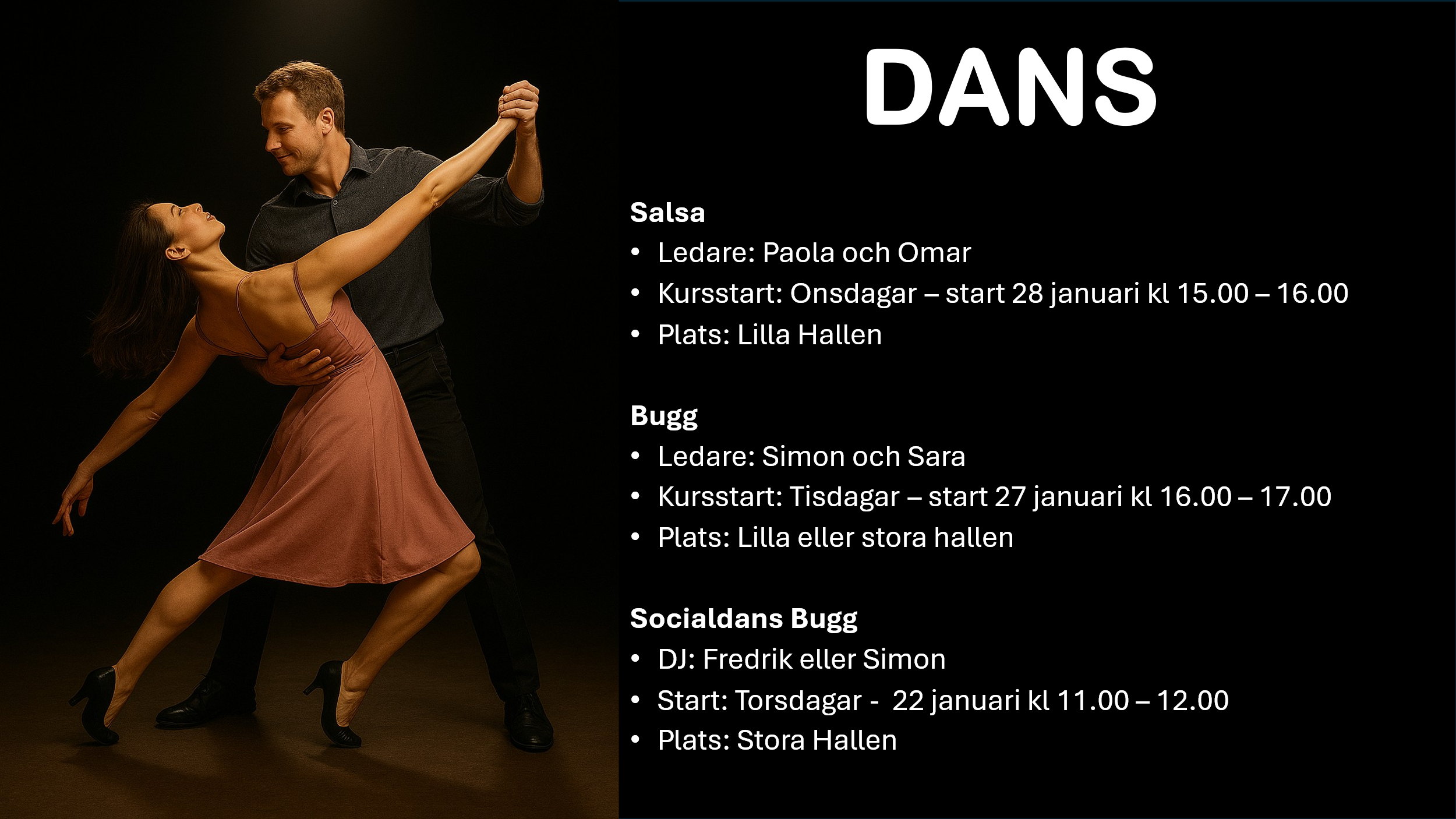 Vid socialdans/Bugg håller vi till i stora hallen.